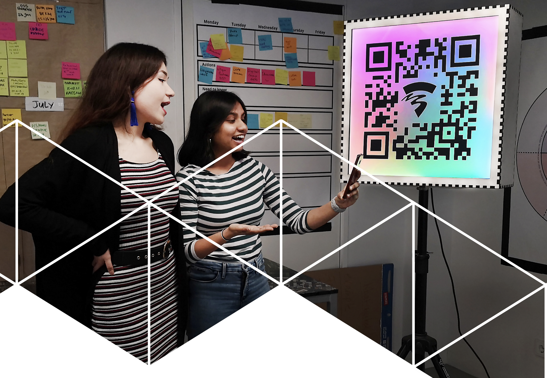 Inspired by the act of ‘writing on walls’ as a way of eliciting civic engagement, we propose a design of a participatory feedback gathering system aiming to engage the campus community in co-creating the campus space. Our prototype combines a physical object’s affordance to attract attention with an internet forum to gather feedback and enable interactions with other users and managing department. More specifically, we designed and made a dynamic QR code display as the physical trigger to attract attention. We chose the format of a QR code because it can be scanned easily from a distance by multiple users simultaneously using current mobile devices, which lowers the threshold for participation. The LEDs create immediately visible information regarding room use, which can then be accessed, and added to, by scanning the QR code by all campus users. The abstract color patterns can be viewed as a form of informative ‘digitally augmented graffiti’. After scanning the code, the campus user will be directed to a website. The first screen asks the question about the use of space, the answers to which are numbered and color-coded corresponding to the LED colors. After selecting an answer, a pie chart visualization of all data gathered so far is shown on the screen and the QR code lamp display is updated accordingly. Following the closed-ended question, the user can access the virtual wall to see written feedback produced by other users, users can either choose to respond to others’ writings by adding comments or ‘likes’, or post their own ideas and feedback